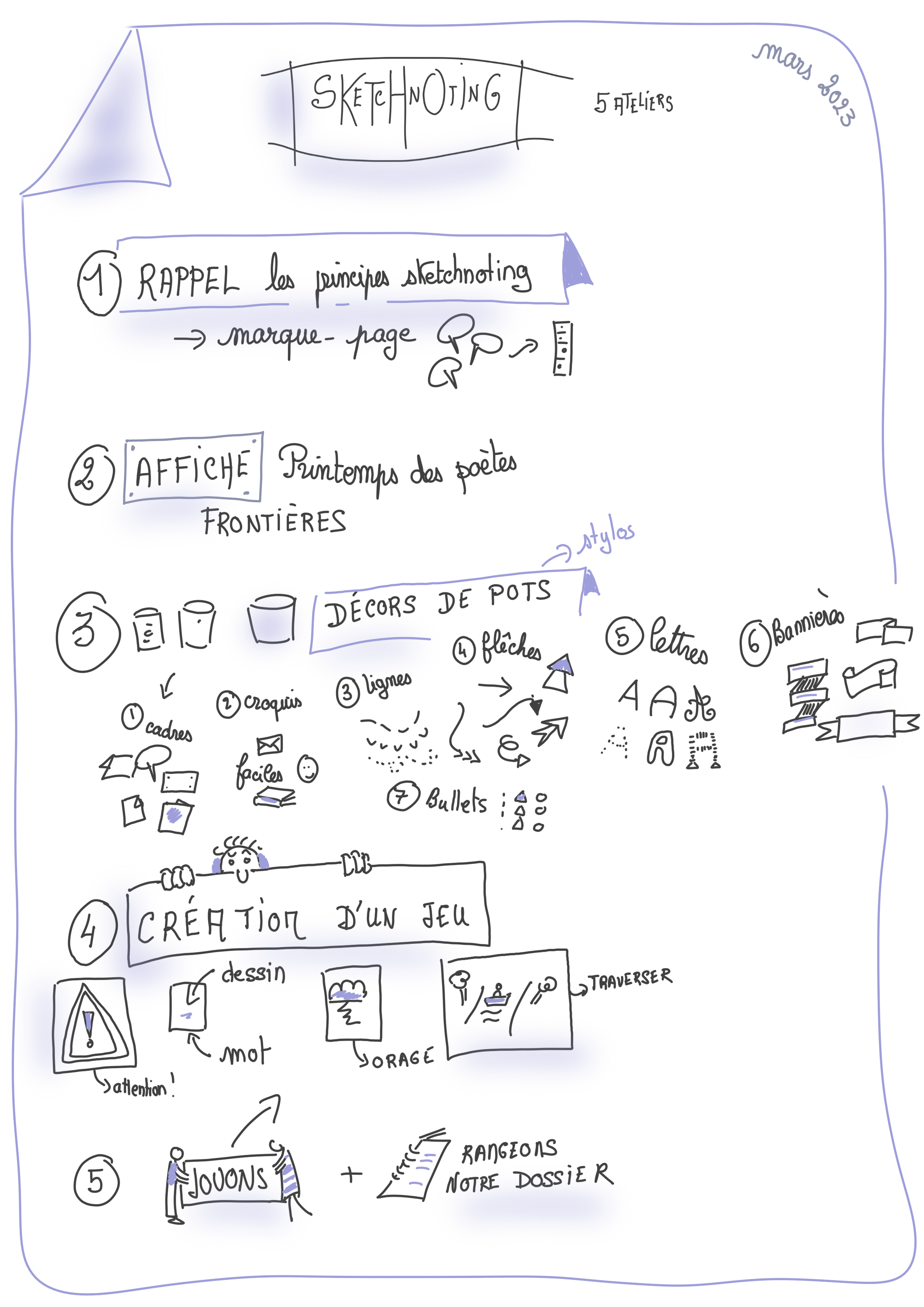 Les ateliers de sketchnoting ont repris en septembre 2022. Voici les fiches des ateliers et quelques réalisations des élèves.